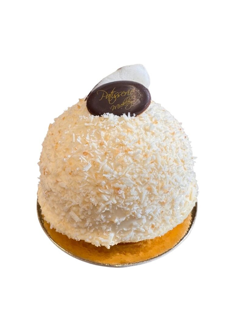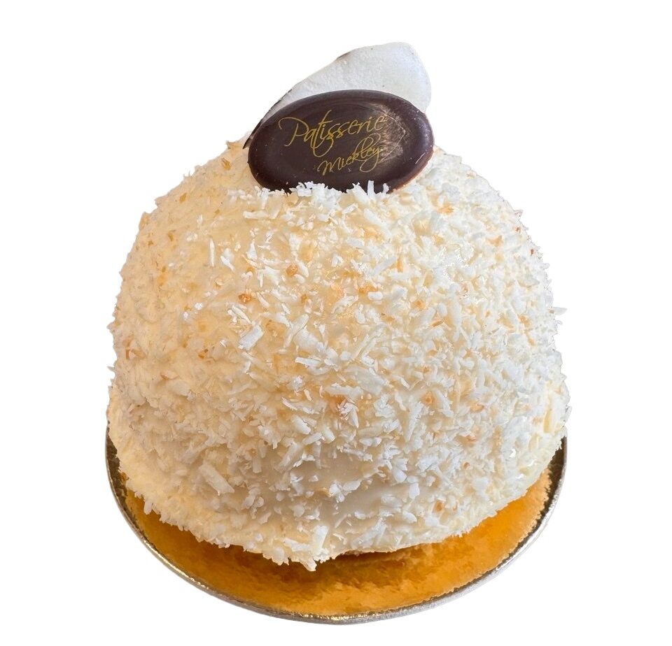 Kokosmousse, heller Biskuit, Kern aus Ananaspüree, Kokosraspel